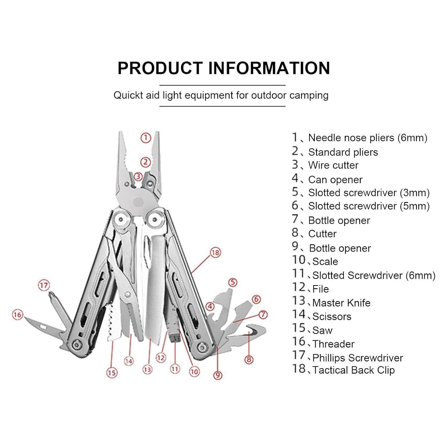 Tools included: Pliers, knife, scissors, wire cutter, saw, screwdrivers (flat & Philips), bottle opener, can opener, file, hook remover, and more