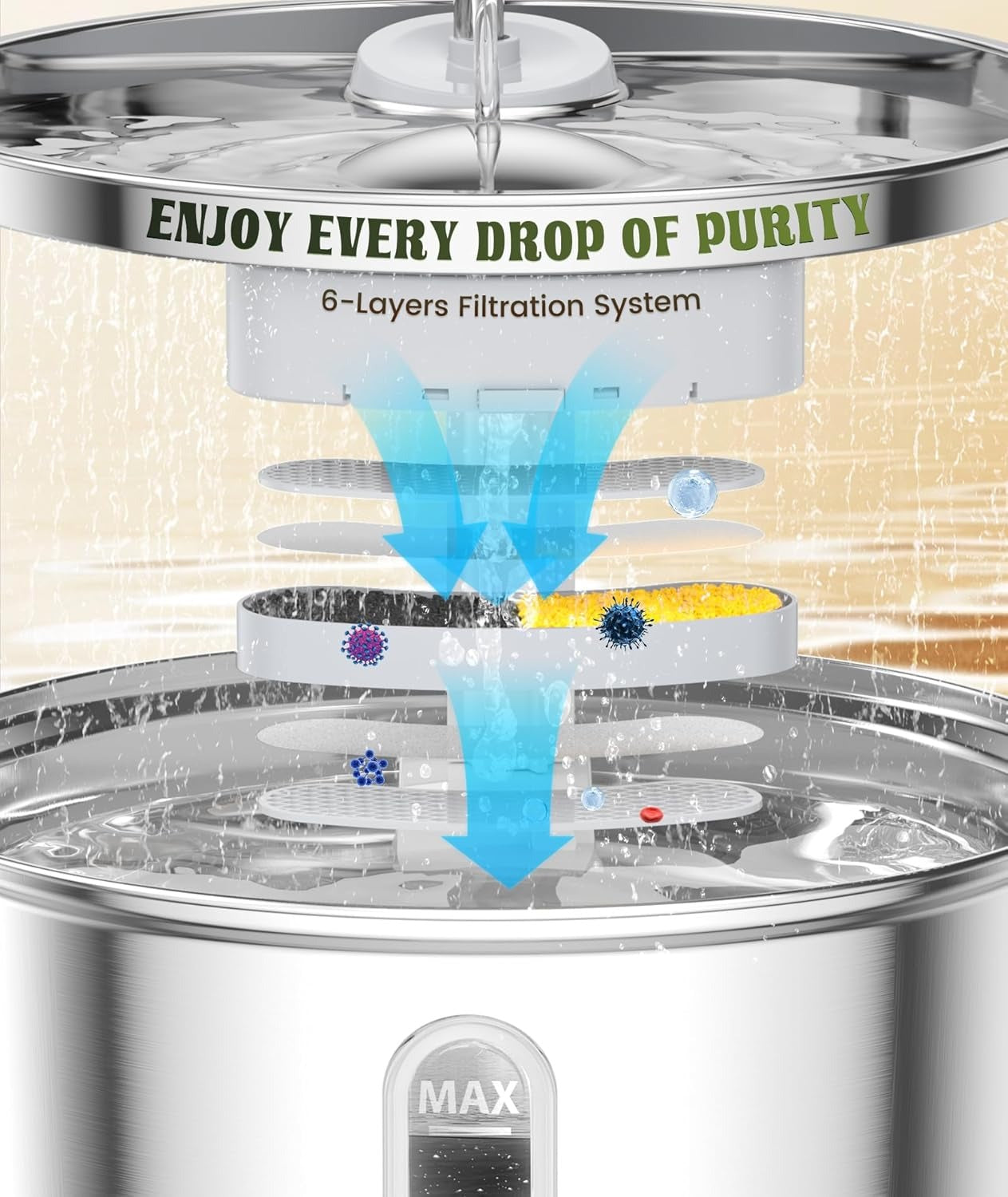 A powerful 6-stage filtration system removes hair, debris, and odors for a cleaner, better-tasting drink. From activated carbon to ion exchange resin, every layer works to protect your pet’s health with every sip.