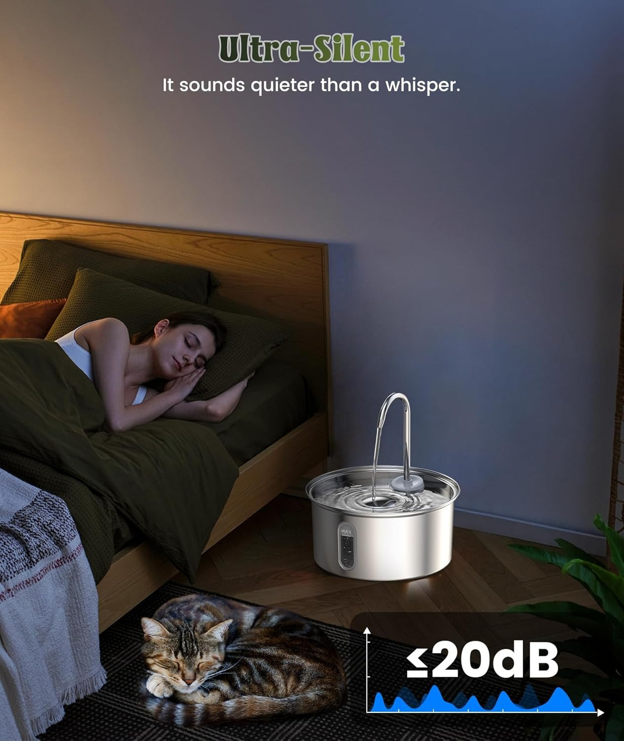 No more splashing, humming, or buzzing. With its ultra-quiet 20dB pump, this fountain works silently - even in your bedroom. Your pet can drink peacefully, and you can sleep soundly without the sound of running water disrupting your night.